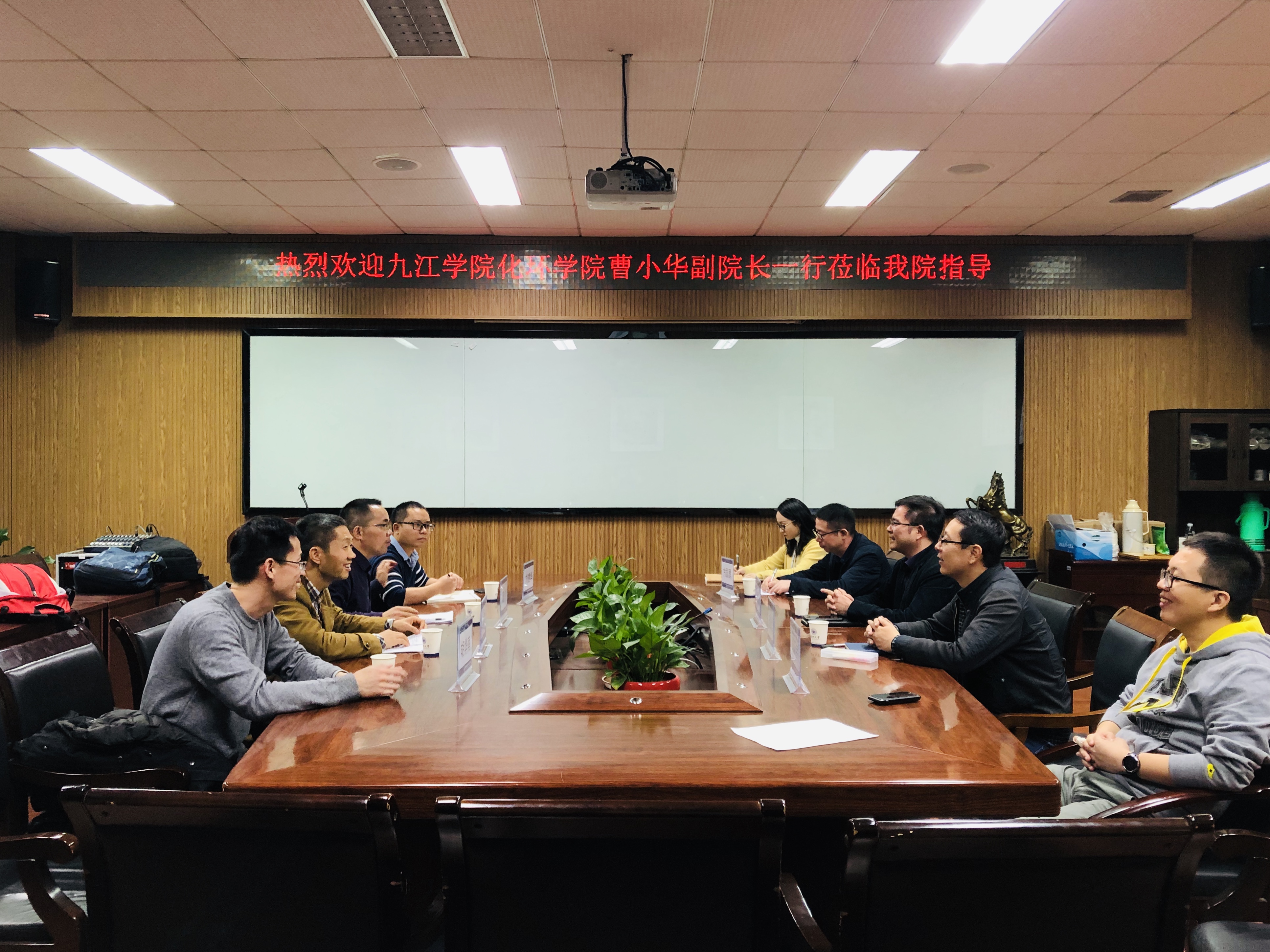 2019年11月22日下午,九江学院化环学院副院长曹小平教授、李国朝副教授、胡华南副教授、刘建华副教授一行四人来到永利3044集团官网参观交流,副院长夏远志、化学系负责人方国勇、应化系负责人王兆伦、材料系负责人杨昕宇等人热情接待了曹小平副院长一行四人并进行了亲切交流。