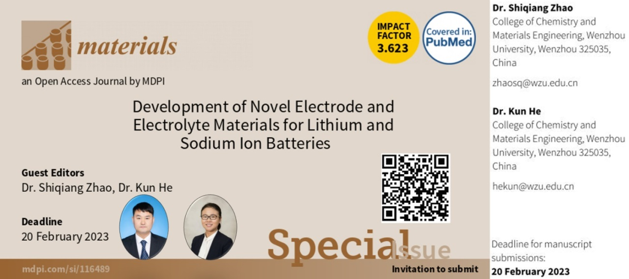 近日,永利化材学院赵世强和何坤博士受邀担任国际期刊《Materials》(《材料》)的电池专刊“Development of Novel Electrode and Electrolyte Materials for Lithium and Sodium Ion Batteries”(锂/钠离子电池新型电极和电解质开发)的Guest Editor(客座主编)。