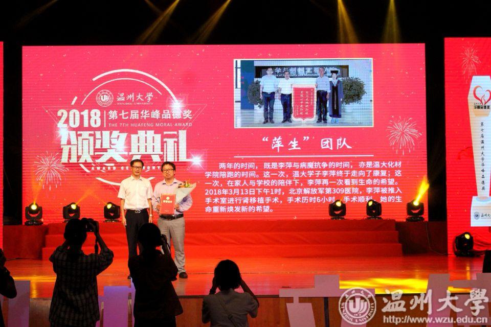 9月12日下午永利3044集团官网庆祝第34个教师节暨第七届华峰品德奖颁奖大会在育英大礼堂落下帷幕,永利张卫兵老师以及“萍生”——助力患尿毒症研究生李萍重获新生团队众望所归,荣获本届“华峰品德奖”。
