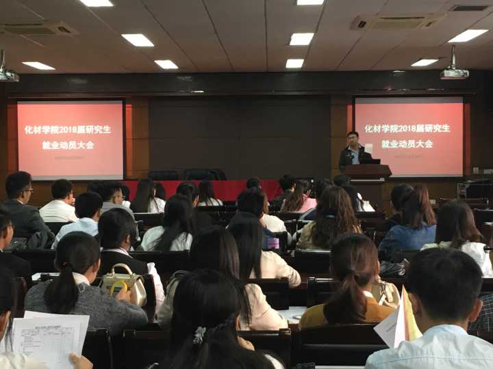 会上,研究生辅导员邹涌彬老师向在座同学介绍了近两年来化材学院研究生的就业情况,邹老师提醒同学们积极关注就业信息,踊跃参加招聘活动。期间,邹涌彬老师以往届师兄师姐的故事为例,指出了签订三方协议、劳动合同时需要注意的事项,并强调了按时办理毕业派遣、档案迁移、户口迁移等流程的重要性。最后,邹涌彬老师提醒同学们在求职的过程中擦亮眼睛、注意财产及人身安全,并祝愿同学们都能找到自己心仪的工作。