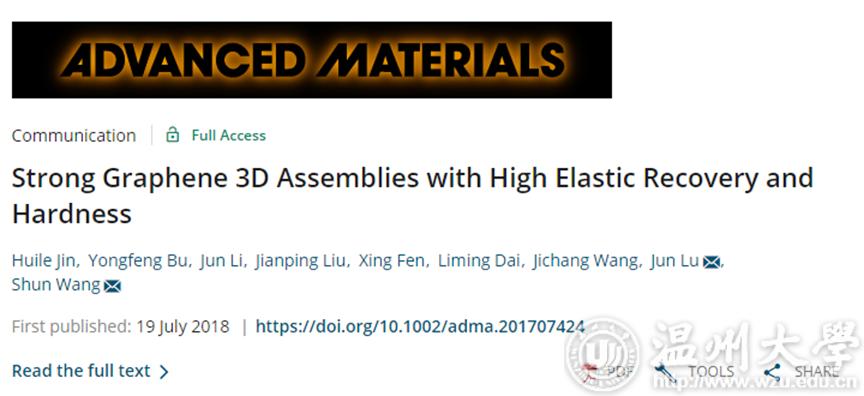 最近,永利化学与材料工程王舜课题组金辉乐博士在三维石墨烯方向取得研究新进展,研究成果以“Strong Graphene 3D Assemblies with High Elastic Recovery and Hardness”为题在线发表于《先进材料》(Advanced Material,2018,DOI: 10.1002/adma.201707424,影响因子21.95)。
