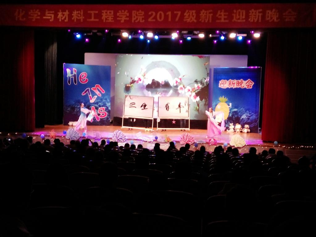 第三篇章“三‘砷’有幸”。诗朗诵《飞翔》让大家对未来四年充满憧憬;紧接着,辅导员林彬彬老师与17化本2班赵凯丽联袂表演《水墨情》,展现中华文化之多娇。接着是暖心时刻,学院精心为在十月份过生日的新生准备了生日蛋糕,在全场同唱的《生日快乐歌》的歌声中,每一位生日的同学都许下了今年的愿望,让在异乡的同学们也有了如家一般温暖的感觉。来自16化本的王路怡同学表示:即使不在家乡化材也总是能给她温暖,带给她力量,让她成为了更好的自己。