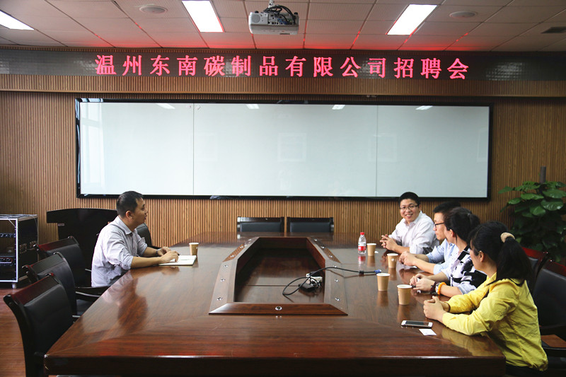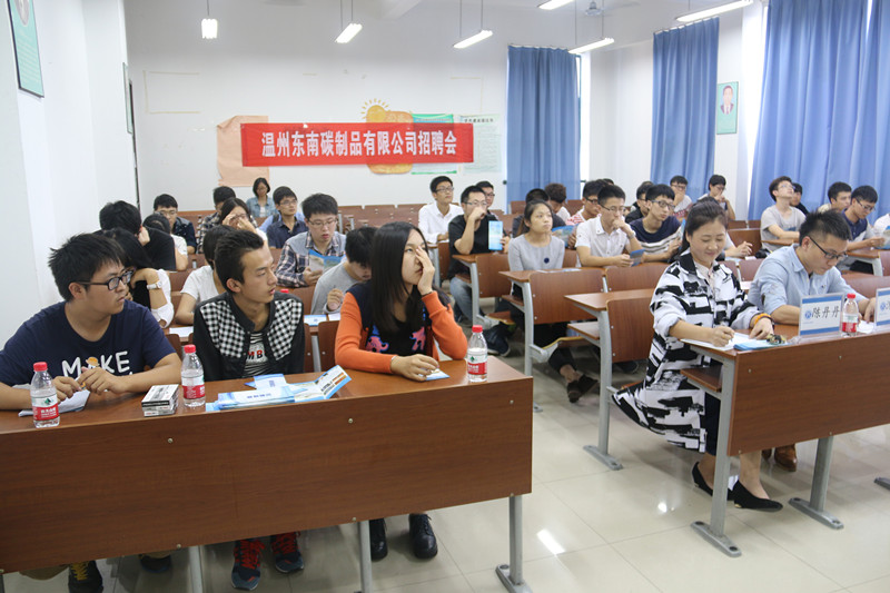 2015年10月21日14:00,温州东南碳制品有限公司招聘会在永利化材学院顺利召开。出席本次招聘会的有温州东南碳制品有限公司副总经理金方义,主管郝书亭以及校友陈丹丹,沈官宏。来自化材,生环以及物电等学院的数十位学生参加了本次招聘会。