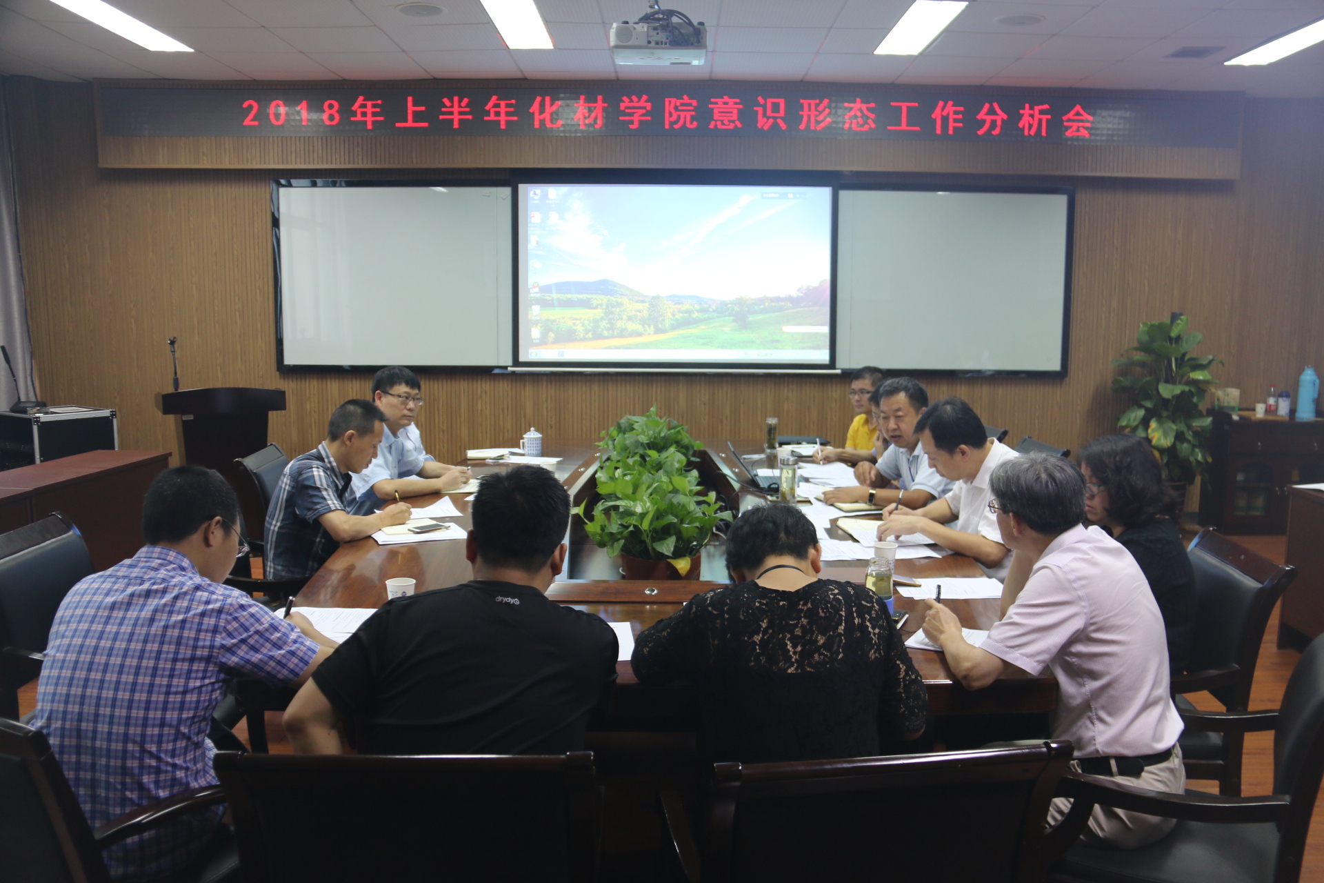 7月12日上午8:30,化材学院领导班子召开2018年上半年党风建设情况分析会和意识形态工作分析会。学院党委书记方乐平主持会议,学院领导班子成员、党委委员及各教工支部书记参加了会议,校党委校长办公室蔡联群主任莅会指导。