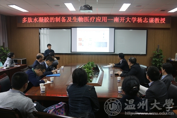 4月18日上午,南开大学生命科学学院杨志谋教授来永利作了题为《多肽水凝胶的制备及生物医疗应用》的学术报告。校长李校堃、化材学院书记方乐平、副院长杨小平、副院长陈久喜、相关师生50余人参加了此次学术报告。