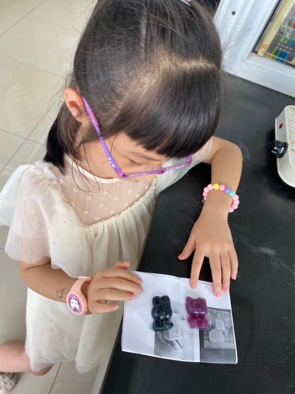 实验中心张卫兵老师为小朋友们精心准备了制作手工香皂的实验,在老师的细心讲解下,小朋友们在自己的实验台上认真的操作,仔细的称量、取用蔬果榨成的天然色素、认真的观察,展现了空前的热情。