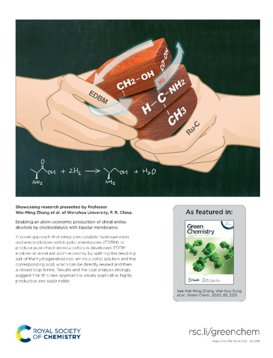 以上研究结果以“Enabling an atom-economic production of chiral amino alcohols by electrodialysis with bipolar membranes”为题,近日被选为inside back cover发表于Green Chemistry(DOI: 10.1039/ C9GC02460C)。永利永利3044集团官网硕士研究生高伟婷为论文第一作者,其导师张伟明教授以及中国科学院宋卫国教授为论文共同通讯作者,温大为第一单位。Green Chemistry为化学领域的国际著名期刊,影响因子为9.405。