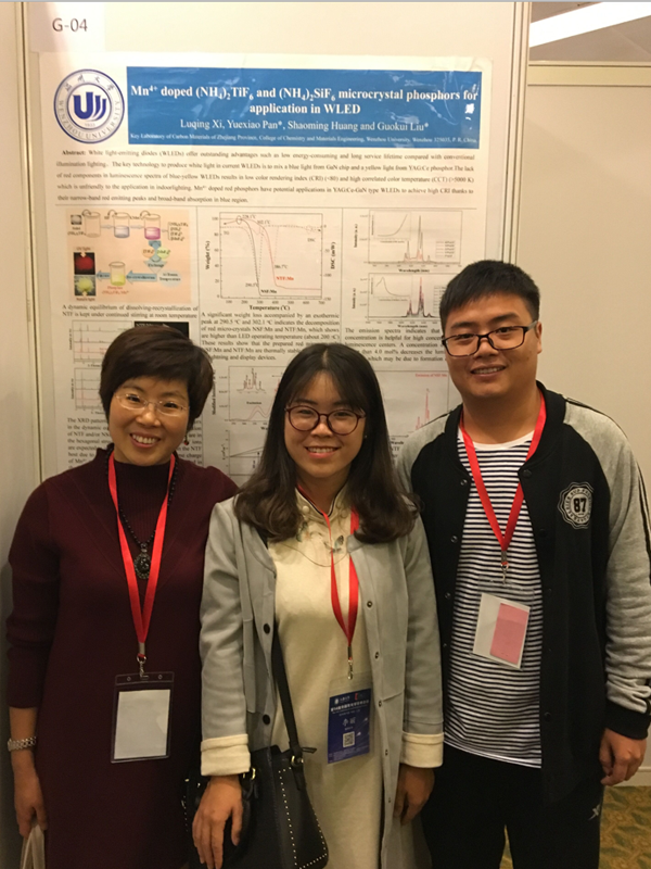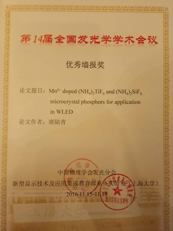 2016年11月15日-18日,第14 届全国发光学学术会议在上海举行,参会400余人。会议共收到墙报作品120余件,经会议常务委员无记名投票评出10项的优秀墙报奖。永利潘跃晓老师指导的15级研究生席陆青题为“Mn4+ doped (NH4)2TiF6 and (NH4)2SiF6 microcrystal phosphors for application in WLED”的墙报荣获了该奖项。特此祝贺!希望永利研究生取得更多更好的科研成果!