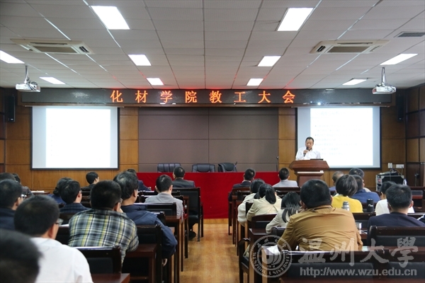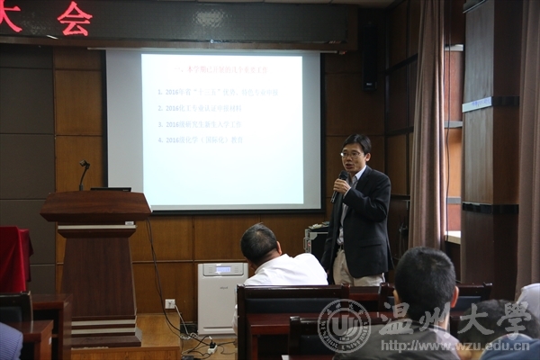 院长杨小平就本学期已开展的工作进行了说明,并针对教学工作、国际化教育、研究生招生工作及教务处工作抽查情况四方面指出了现阶段的工作要点。副院长陈久喜对本学期学院科学、学生学科竞赛取得的成绩进行了总结,就《2016年校级教改项目申报的通知》进行说明,对永利承办第九届浙江省大学生化学竞赛的工作进行了部署,并鼓励教职工积极开展科技创新活动。党总支副书记潘从义对学院“百名教授访百家”进行了总结,并对学院就业工作、学生团学工作、宣传工作开展重点进行了说明。