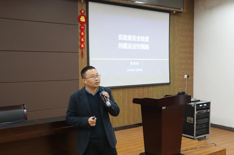 学院副院长陈锡安结合学校实验室安全检查存在的问题进行了通报。主要就实验室安全用电、消防设施、个人防护、通风橱使用、化学品存放、公共卫生等方面的问题进行了详细的介绍并提出了明确的整改措施。他呼吁广大教职工真正做到心中有责任、眼里有细节、实验讲规范、安全有保障。