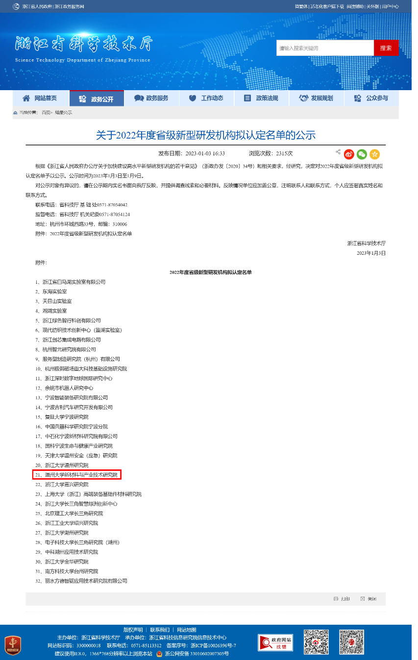 日前,浙江省科学技术厅正式公布2022年度省级新型研发机构认定名单,认定32家企业(研究院)为2022年度浙江省新型研发机构。永利新材料与产业技术研究院榜上有名。