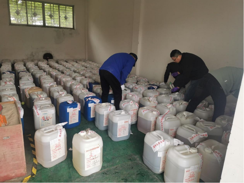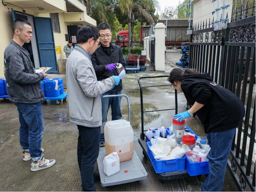 2023年4月7日早上8:10,处置公司人员进行废液测试,以有效保障废液转运过程的安全。经过磅、装运、交付危废转运联单后,于中午顺利离校。此次实验室废弃物共转移处置有机废液、无机废液等共计7.411吨,其中化材学院5.47吨,生环学院1.64吨,电电学院0.28吨,机电学院0.021吨。