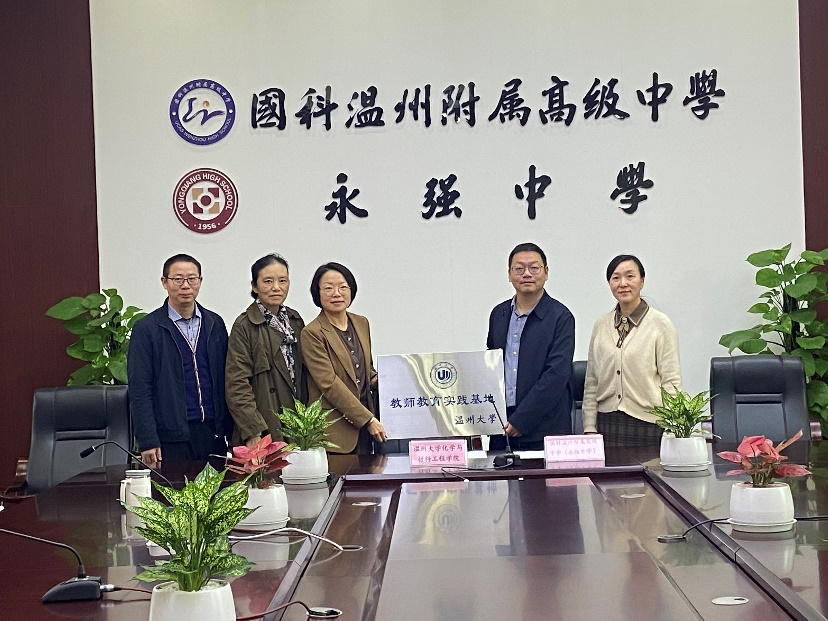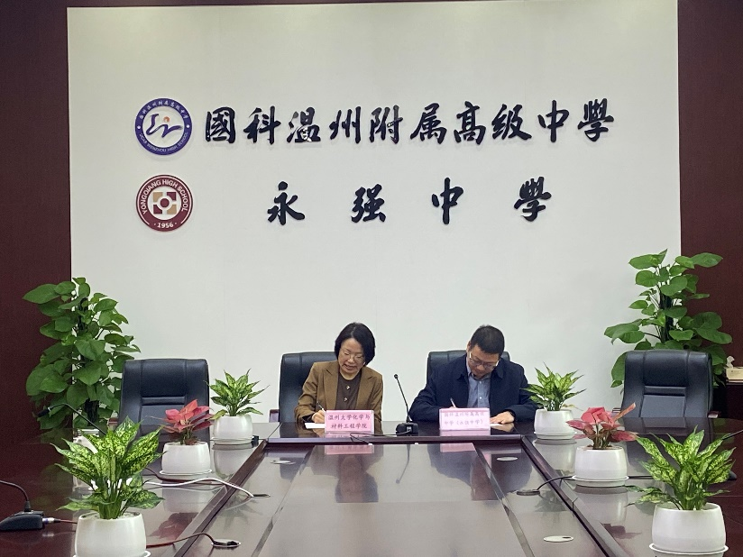 2023年11月29日,永利3044集团官网与温州市龙湾区国科附属高级中学(永强中学)共建教育实践基地的签约仪式在永强中学行政楼活动室举行。化材学院党委书记刘吟、化学系主任方国勇老师、陈迪妹教授,永强中学副校长李勇、教研处主任谢炳杰以及化学教研组长李桂双老师出席签约仪式。