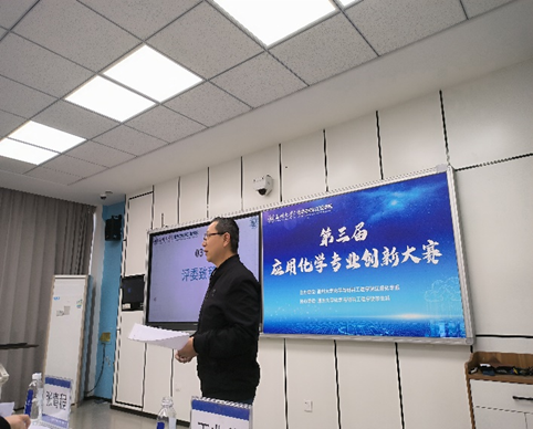 应用化学系主任王兆伦老师做总结发言,他指出本次比赛充分展现了化材学子参与科研创新的热情,希望同学们继续完善参赛项目,争取在后续的“挑战杯”、“互联网+”的竞赛勇夺佳绩。