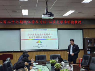 2024年1月6日上午9点,汕头大学李明德教授受邀来到永利3044集团官网,在11B-204教室为师生们作了题为“分子聚集态固体光功能材料的激发态超快探测与调控”的学术报告。本次报告由永利3044集团官网的夏远志教授主持,吸引了众多师生踊跃参加。