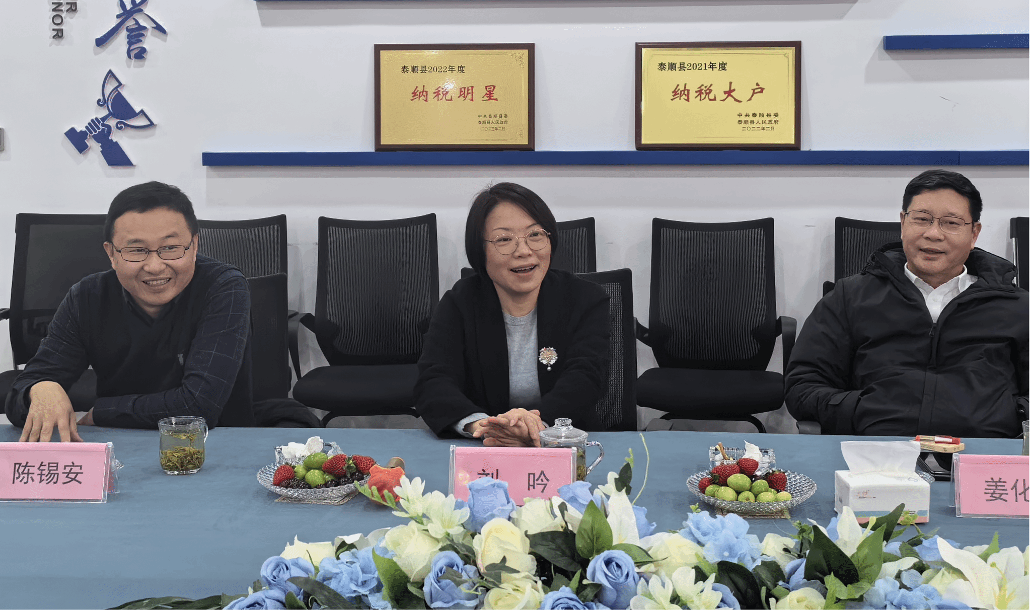 温大泰顺校友会理事会会长、县政协原副主席胡昌迎(80化学),县教育局原党委委员、副局长徐崇专(91化学),公司董事长叶细何(95工分)对刘吟一行的到访表示热烈欢迎。