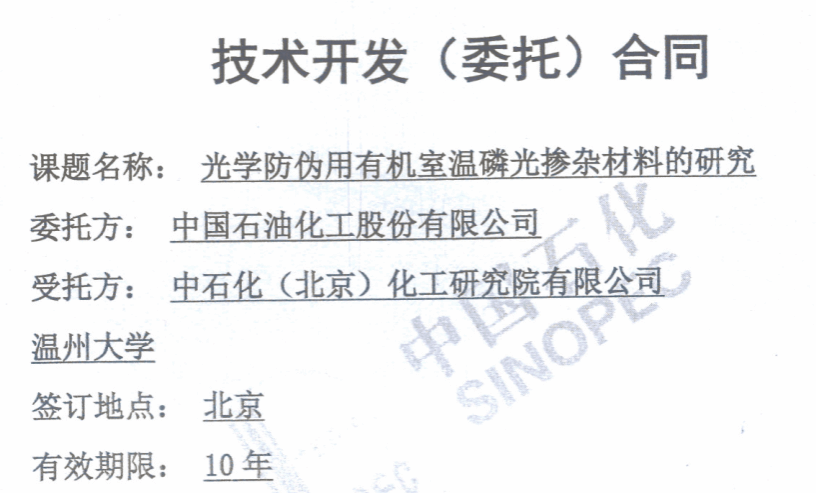 近日,永利雷云祥特聘教授(项目负责人)、黄小波教授、戴文博博士联合中石化(北京)化工研究院有限公司正式与中国石油化工股份有限公司签署为期三年的技术开发(委托)合同,签约总研究经费831万人民币,其中永利3044集团官网负责研究经费190万。研发课题名称为:光学防伪用有机室温磷光掺杂材料的研究;该横向研究旨在设计制备磷光量子效率>30%,磷光寿命>1 s的新型有机室温磷光材料,并进一步将磷光材料开发为可规模化制备、经济低廉、稳定性高、性能优异的新一代高级防伪油墨、防伪标签、防伪纸张等。