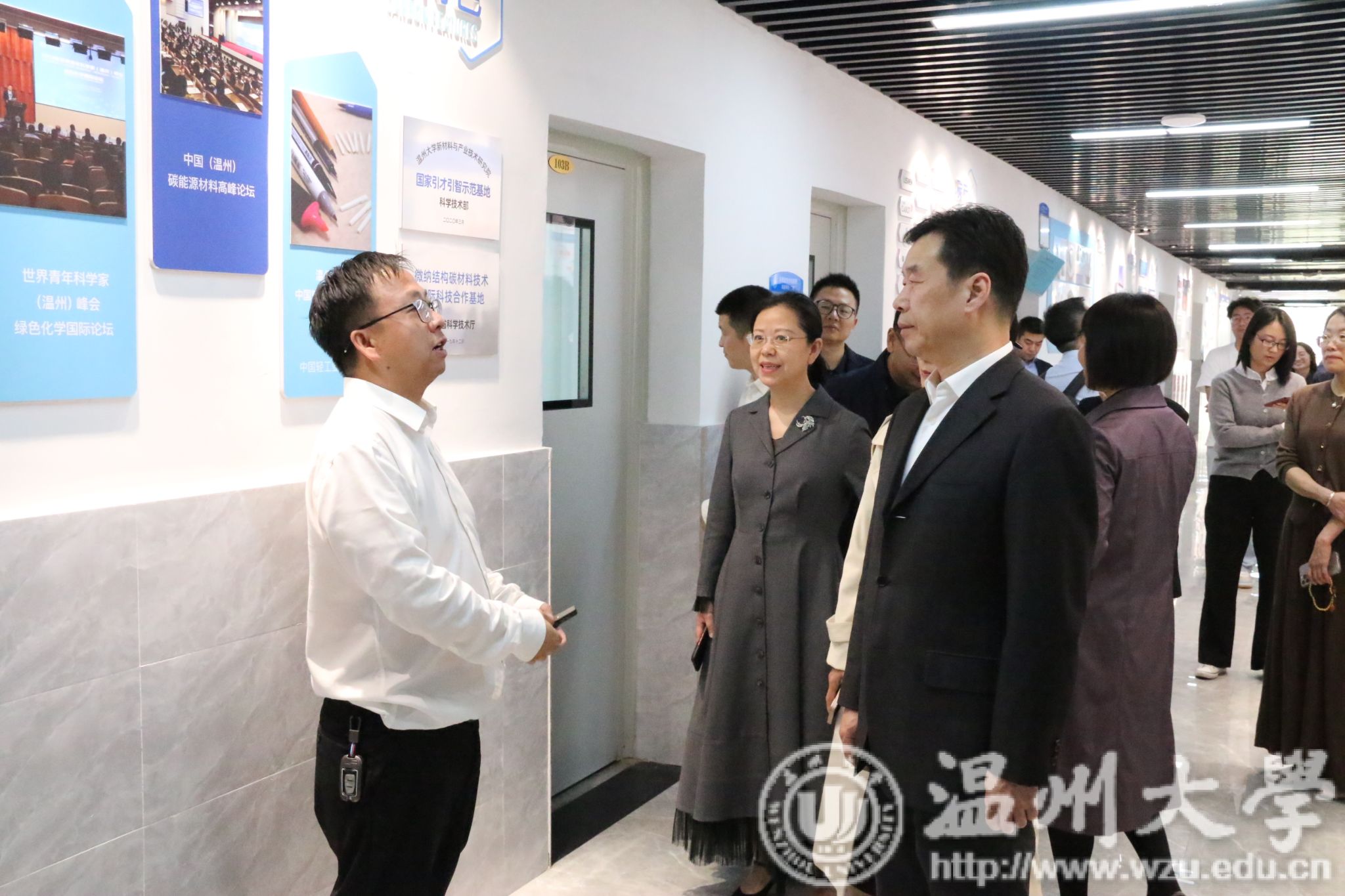 4月11日下午,浙江省政协常委、教科卫体委主任郑瑶一行莅临永利省碳材料技术研究重点实验室调研,温州市政协副主席王丽峰、温州市政协常委吴文玲等陪同调研。学校党委副书记庄兴忠、副校长刘玉侠、校期刊社社长缪心毫、党校办副主任周德奎、化材学院党委书记刘吟、院长杨植、副院长陈锡安出席调研。