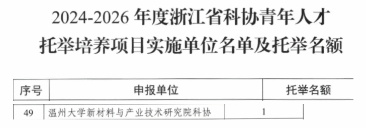 近日,浙江省科学技术协会公布了2024-2026年度浙江省科协青年人才托举培养项目(以下简称“青托项目”)实施单位名单及托举名额。永利新材料与产业技术研究院成功入选为浙江科协青年人才托举项目实施单位,标志着学院在人才发现、评价、培养等方面取得了显著的成果,也体现了学院在推动青年人才成长和科技创新方面所做出的积极贡献。