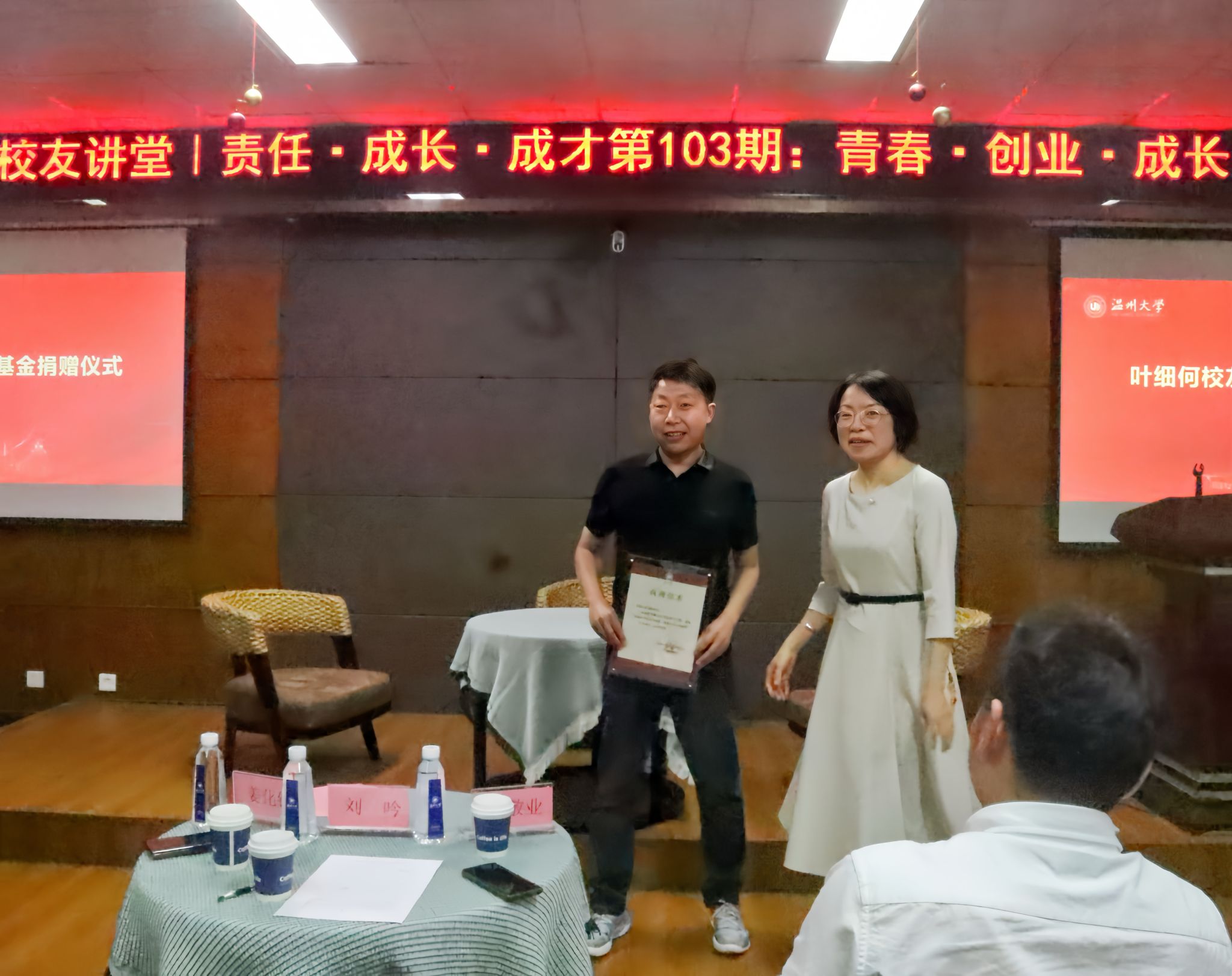 捐赠仪式上,刘吟书记向叶细何颁发捐赠证书。叶细何校友以个人名义一次性捐赠10万元注入到学院教育基金,用于学院困难学生的资助与育人工作。