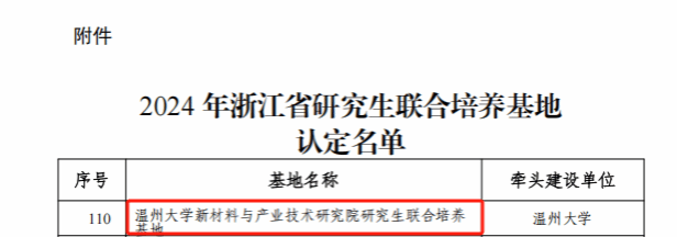 近日,浙江省教育厅发布《关于公布2024年浙江省研究生联合培养基地认定结果的通知》的名单,永利3044集团官网新材料与产业技术研究院研究生联合培养基地成功认定为省级研究生联合培养基地。这一认定标志着永利在新材料、新能源领域硕士研究生联合培养、导学模式创新方面迈出了重要一步,彰显了学院在产教融合、协同创新方面的显著成效。