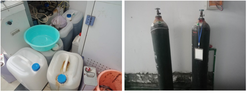 气体钢瓶未固定且没有标签,药品柜里仍存有化学品 |