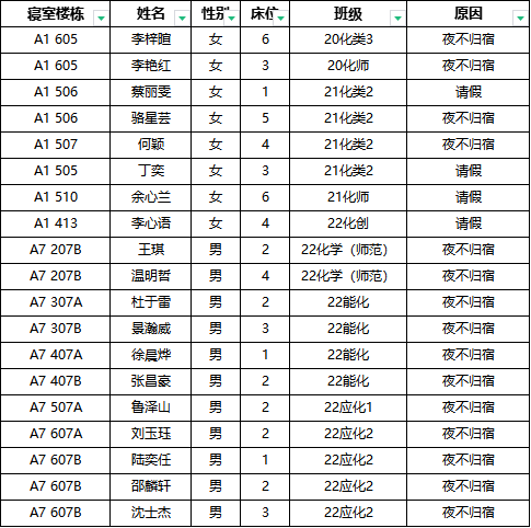 1.每周不定期检查学生夜不归宿情况,检查时间为22:00--23:00之间;