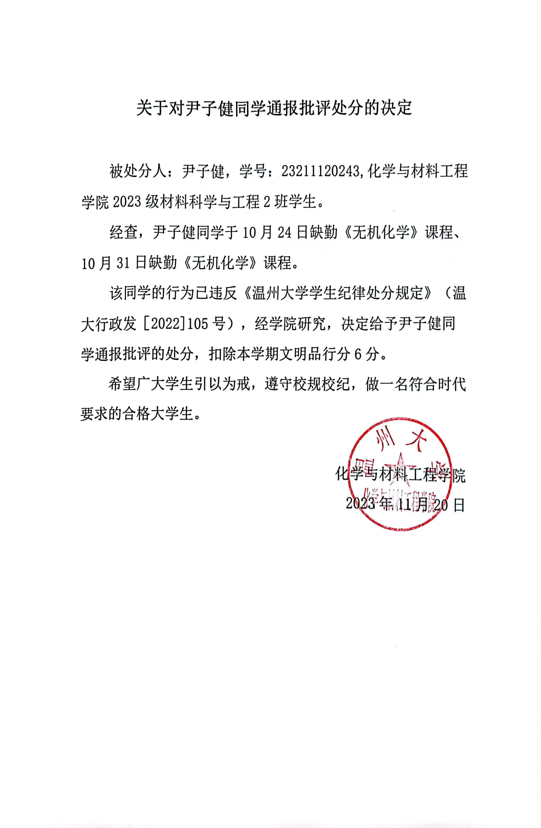 关于对尹子健同学通报批评的决定