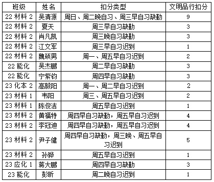 2、根据《永利3044集团官网化材学院大一、大二早晚自习管理规定(201809修订)》,1次早、晚自习缺勤扣3分,学业发展部将在每周在“永利3044集团官网”微信公众号平台公布本周考勤结果,如对公布的考勤结果有异议请当周周五下午4:30前到学生科办公室11B223说明情况,过时无效。22级、23级联系邹培杰老师。3、每周将在化材学院官方网站上公布上周最终考勤结果。4、早晚自习考勤结果纳入月形象班级考核。