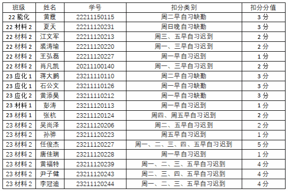 2、根据《永利3044集团官网化材学院大一、大二早晚自习管理规定(201809修订)》,1次早、晚自习缺勤扣3分,学业发展部将在每周在“永利3044集团官网”微信公众号平台公布本周考勤结果,如对公布的考勤结果有异议请当周周五下午4:30前到学生科办公室11B223说明情况,过时无效。22级、23级联系邹培杰老师。3、每周将在化材学院官方网站上公布上周最终考勤结果。4、早晚自习考勤结果纳入月形象班级考核。
