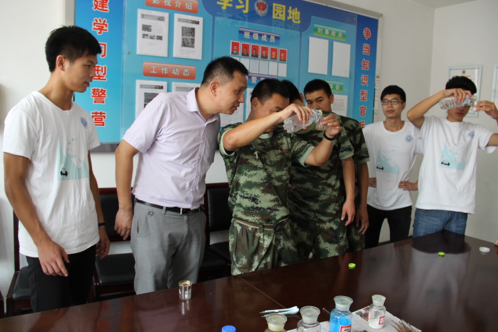 为突出学院特色,展示化材风貌,实践队为消防官兵们准备了“水中花园”、“大象牙膏”两个具有观赏性的化学实验。消防官兵面对神奇的化学现象赞叹不已,在不经意间,消防官兵已经参与和融入其中,感受到了化学的奇妙。