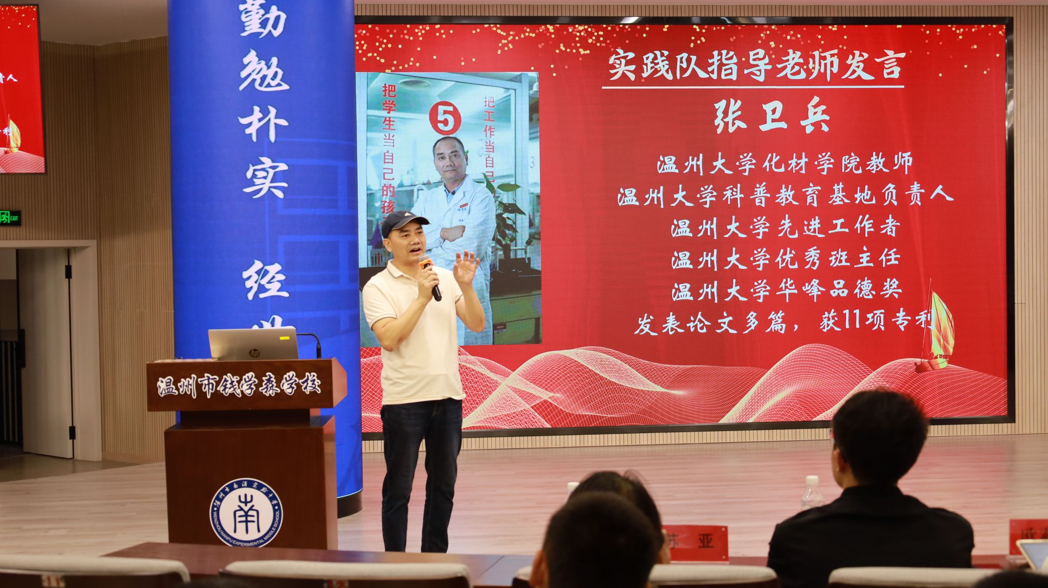 实践队指导老师张卫兵讲述了开展化学科普助力中小学生科学素养提升的工作初心,以及实践队历年的活动内容、取得的各项成绩,希望通过本次夏令营实践活动继续为科学赋能学生的成长发展做贡献。