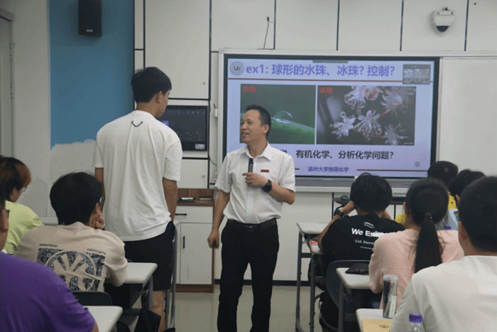 “天涯共此时,人生同启蒙”。课堂上,王舜教授围绕“物理化学绪论”主题,以深入浅出的方式,首先提出了“为何学”物理化学的思考,通过一系列引人入胜的实例——球形水珠与冰珠的奇妙变化、面粉爆炸的科学解释,以及硅胶作为高效干燥剂的原理等,迅速点燃了学生们对物理化学的好奇心与探索欲。他以生动有趣的讲解,让复杂的物理化学概念变得直观易懂,极大地提升了学生的学习兴趣。进而以学生个性化专业发展诉求为导向,结合“学什么”、“怎么学”,顺势带领学生展开学习方法和研究对象的碰撞交流,最后从物理化学的特点引出对“悟”化人生、生涯规划的深度思考。王教授善在课堂中以细节打动人心,在潜移默化中将思政之“盐”溶于课程之“汤”,在专业教育中不断增强学生的价值认同和道路自信,激发了学生立志科技报国的“课程思政”之效,得到了两校师生的热烈回应。