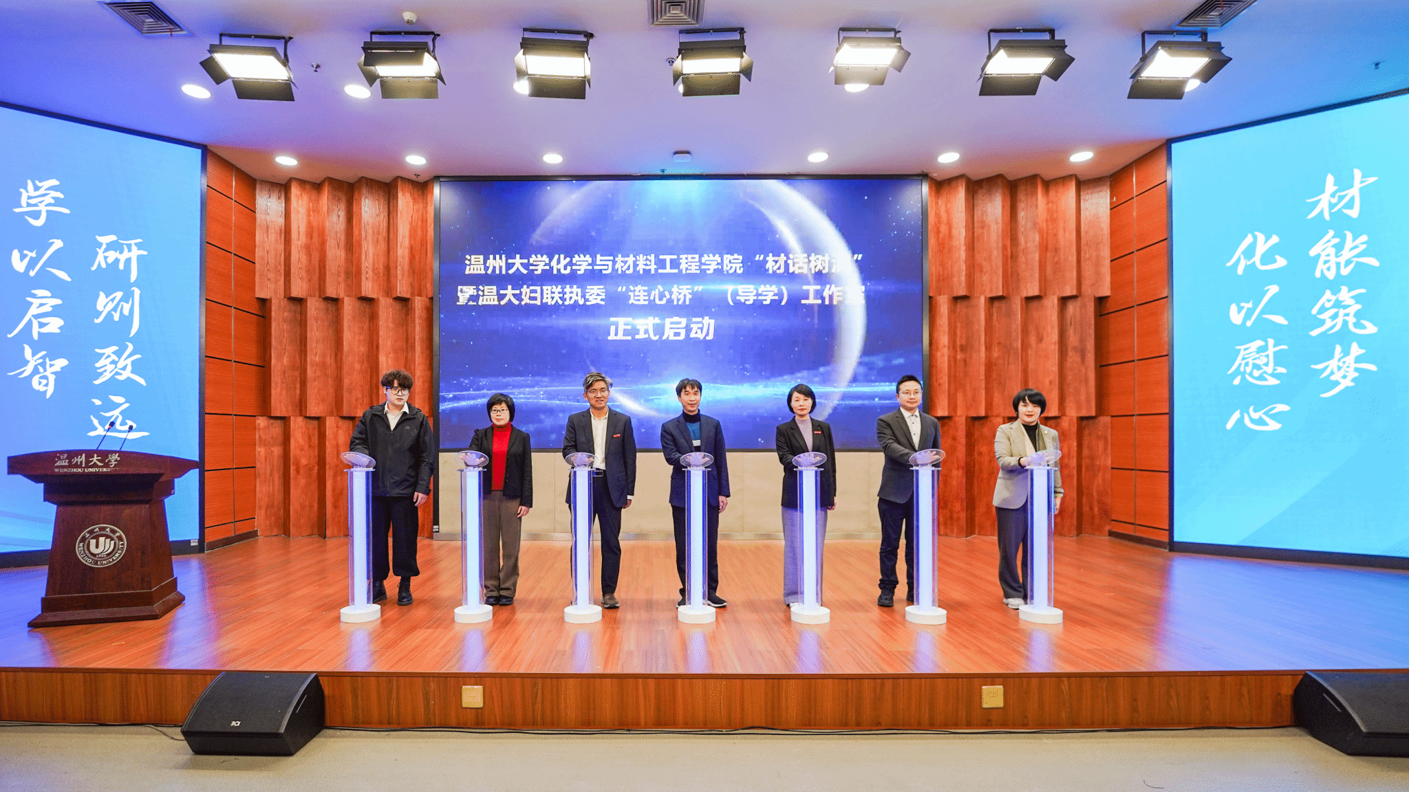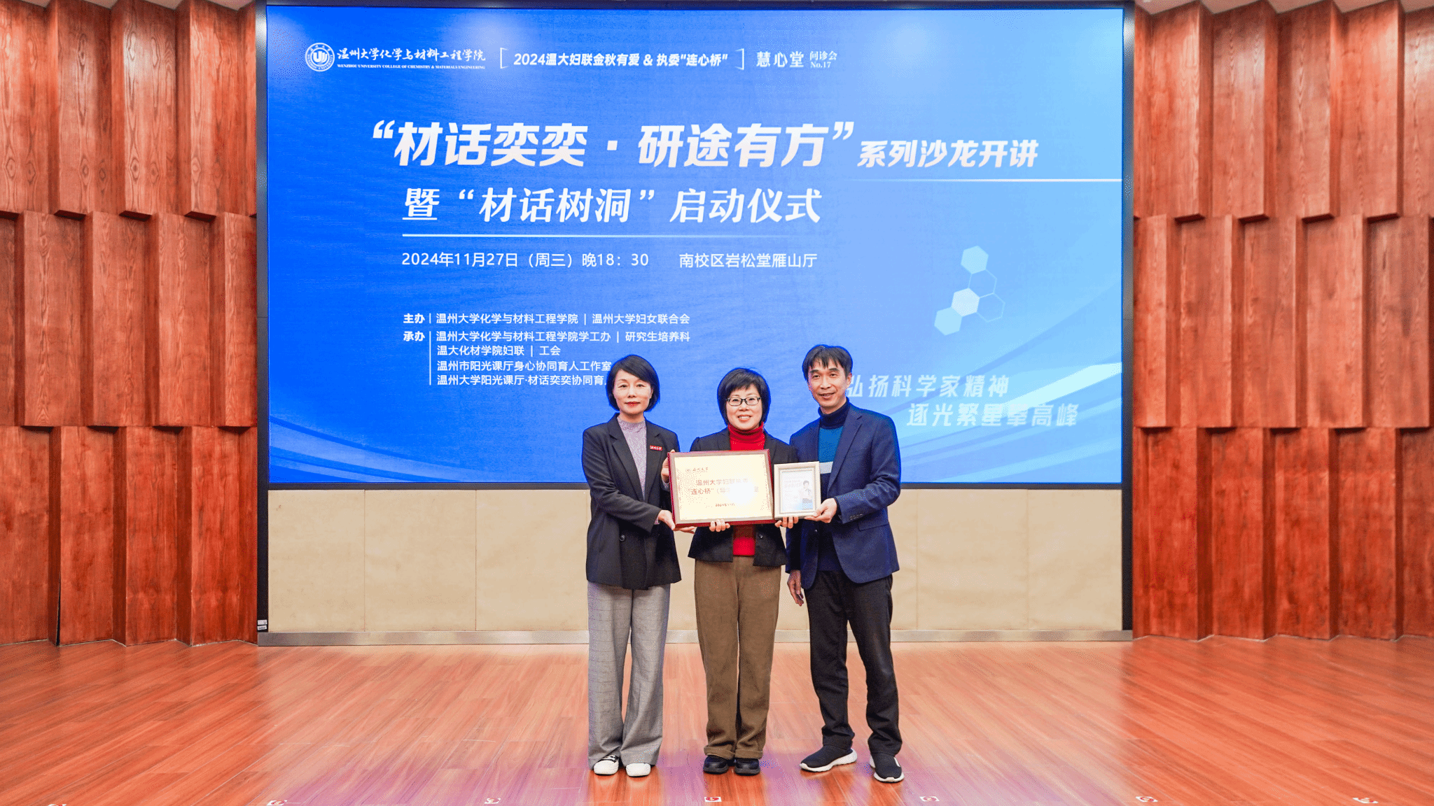由温大妇联执委潘跃晓教授打造的“连心桥”执委工作室,旨在面向研究生开展导学服务,鼓励研究生们探索攀登科学高峰,在自我突破、触摸前沿的过程中,重塑自我、实现蝶变。黄文浩、陈文远、邹超、金辉乐、潘跃晓、王晓华、东洋洋共同开启温大妇联执委“连心桥”工作室。黄文浩和陈文远为潘跃晓授予永利3044集团官网妇联执委工作室牌,并送上巾帼服务纪念海报。