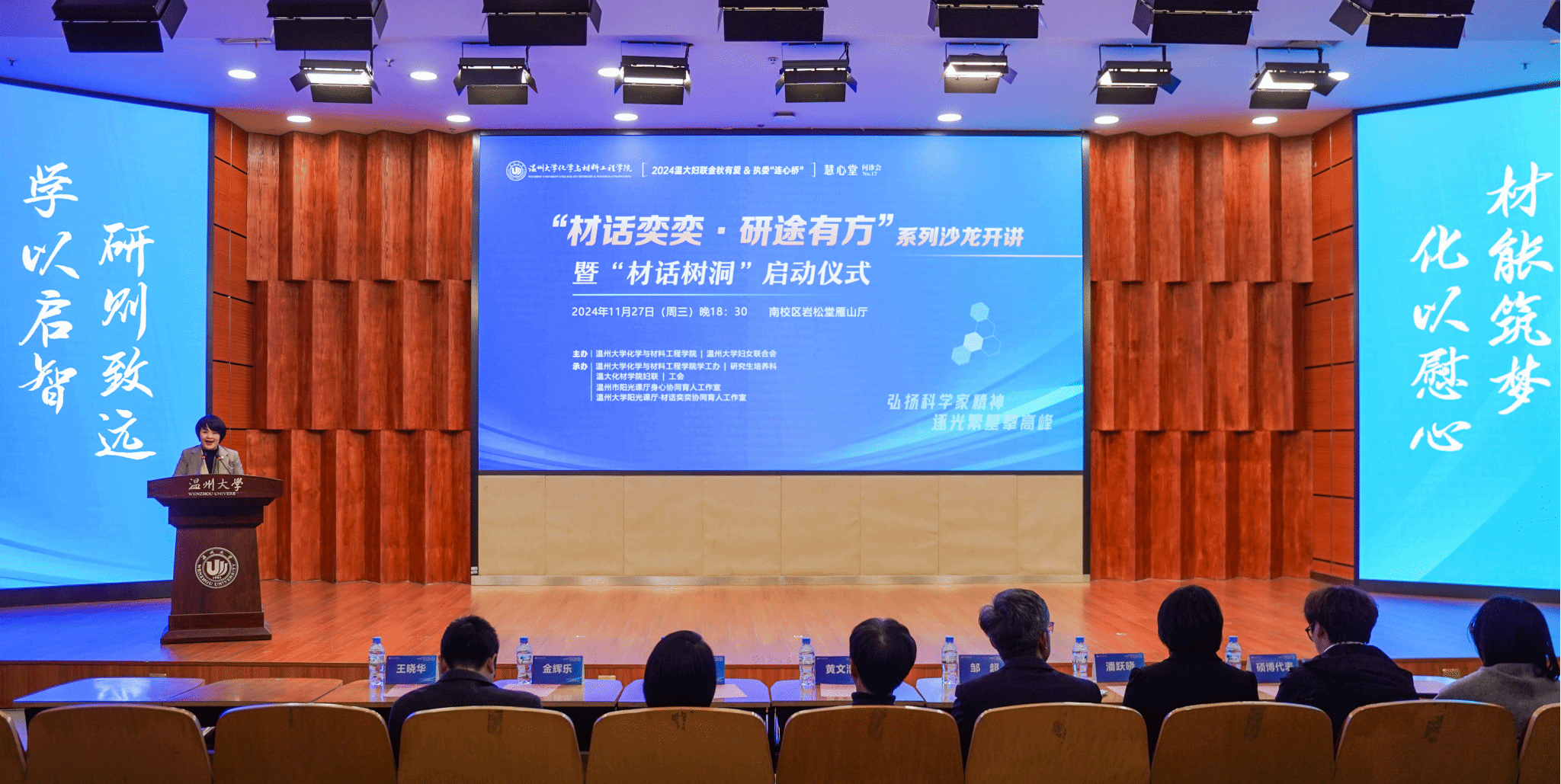 近日,温大妇联首个执委工作室—“连心桥”工作室成立启动仪式在南校区岩松堂雁山厅举行。永利3044集团官网研工部部长黄文浩,永利3044集团官网妇联副主席、电气与电子工程学院书记陈文远,永利3044集团官网化材学院党委书记邹超,副院长金辉乐,副书记王晓华,博士生导师、永利3044集团官网妇联执委潘跃晓,硕博代表东洋洋出席本次启动仪式,研究生新生150余人参与。