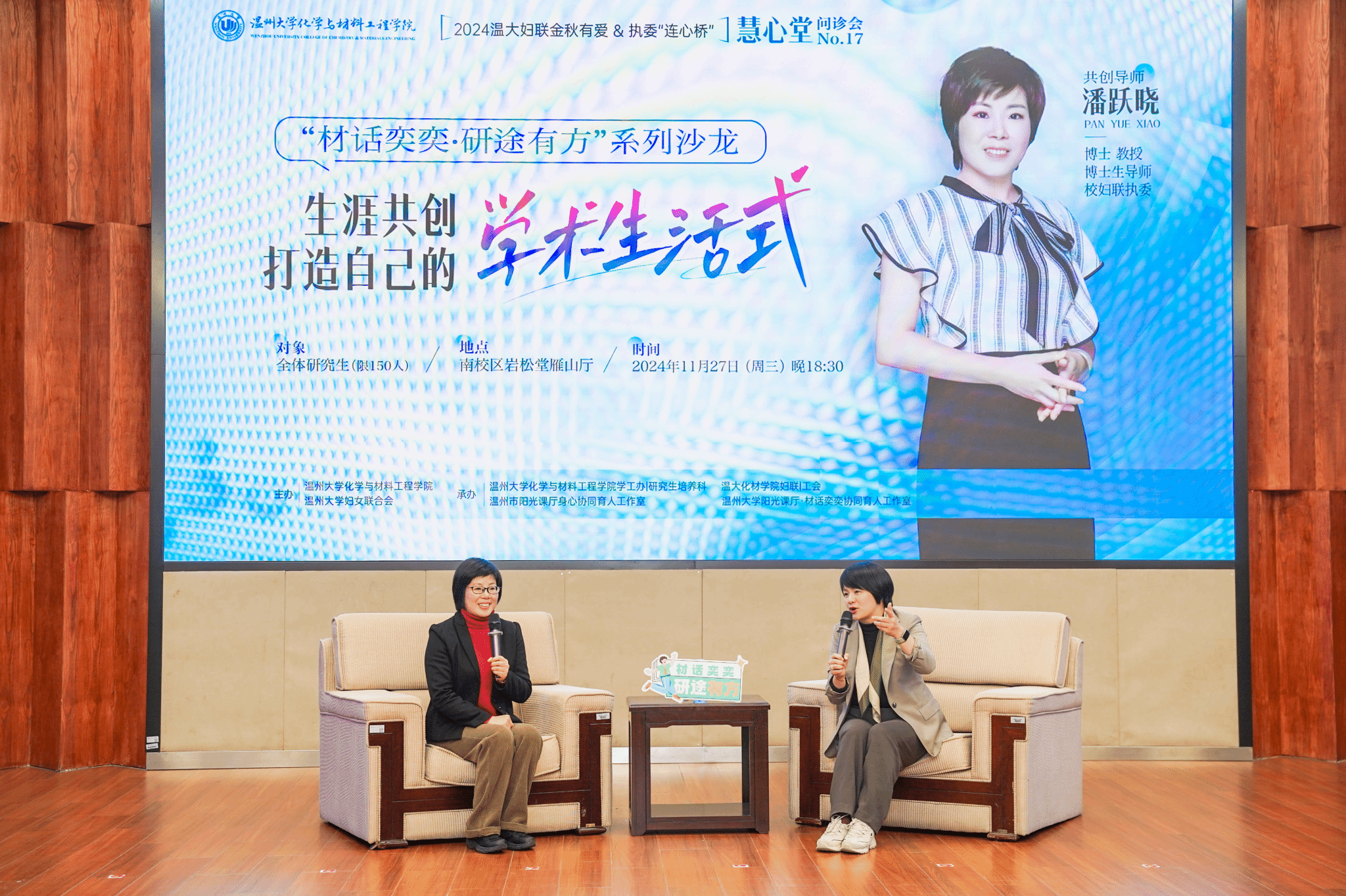 本次活动不仅为化材学院的研究生们搭建了一个高质量的导学共同体,也通过永利3044集团官网妇联执委“连心桥”工作室的设立,体现了学校、学院对研究生群体的身心健康平衡与导学体系建设的高度重视和持续关爱。未来,永利3044集团官网妇联将充分聚焦师生发展愁难急盼,发挥巾帼力量,依托执委专业优势,持续建立若干执委工作室,助力服务学校中心工作高质量发展。