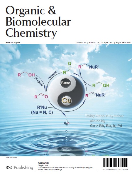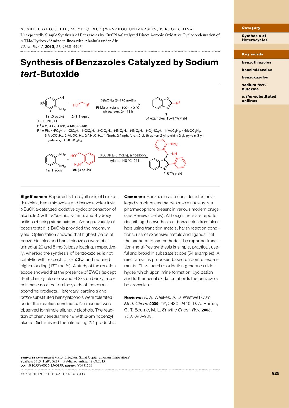 (25) Lei Yu,* Mingxuan Liu, Fenglin Chen and Qing Xu.* Heterocycles from Methylenecyclopropanes, Org. Biomol. Chem. 2015, 13, 8379-8392 (SCI-III, IF: 3.562, 外封面论文). DOI: 10.1039/C5OB00868A.  (26) Xinkang Shi, Junmei Guo, Jianping Liu, Mingde Ye, Qing Xu.* Unexpectedly Simple Synthesis of Benzazoles by t-BuONa-Catalyzed Direct Aerobic Oxidative Cyclocondensation of o-Thio/Hydroxy/Aminoanilines with Alcohols under Air. Chem. Eur. J. 2015, 21 (28), 9988-9993 (SCI-II, IF: 5.731). DOI: 10.1002/chem.201501184 Highlighted by Synfacts: Synfacts 2015, 11(9), 0925 Highlighted by Advances in Engineering as a Key Scientific Article contributing to excellence in engineering, scientific and industrial research