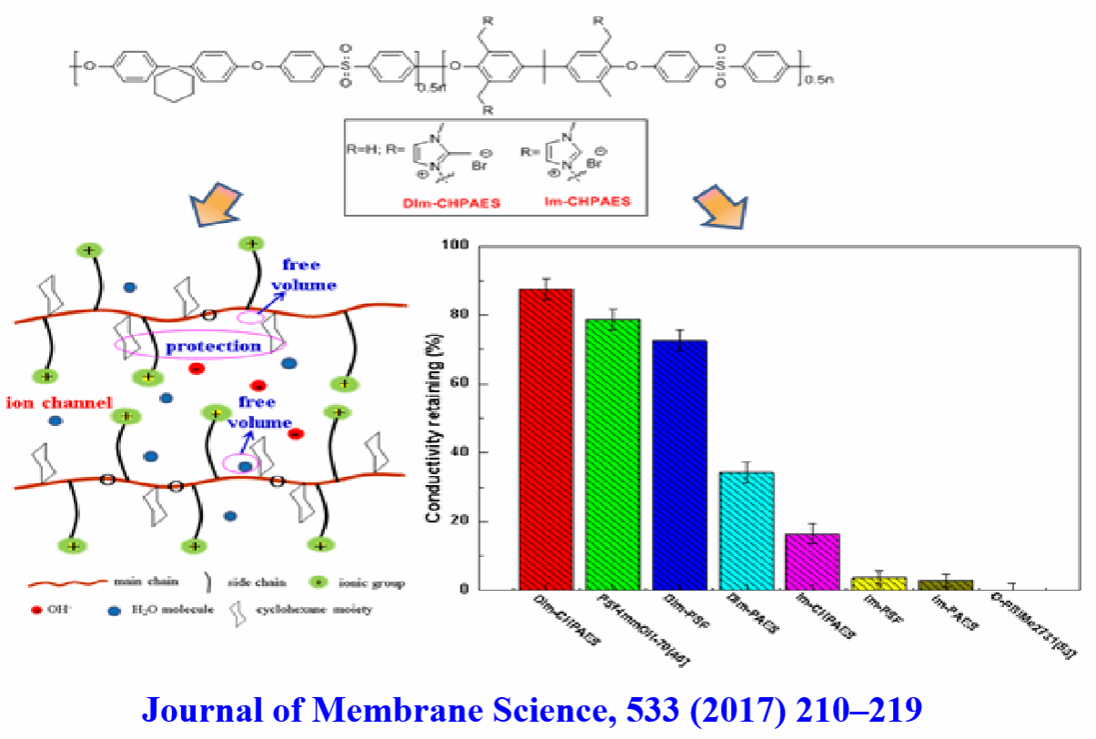 他引人非复平面结构、以及可交联的咪唑/吡啶结构(CN105694077A,RSC Advances 2016),得到高稳定性阴离子导电膜(CN106633032A, CN106633032B; Journal of Membrane Science 2017),成功用于碱性燃料电池(CN105542148)和液流电池(CN105566884A)开发;近期,还开发了国际领先的各向异性聚苯并咪唑多层纳米片高效水电解制氢复合隔膜(Advanced Energy Materials 2023)和双交联宽温域磷酸掺杂聚苯并咪唑宽温域燃料电池隔膜(Nature Comm.,2024),彻底解决领质子交换膜材料在200 0C以上温度的稳定性问题,为下一代高性能燃料电池和制氢装备开发奠定了基础。