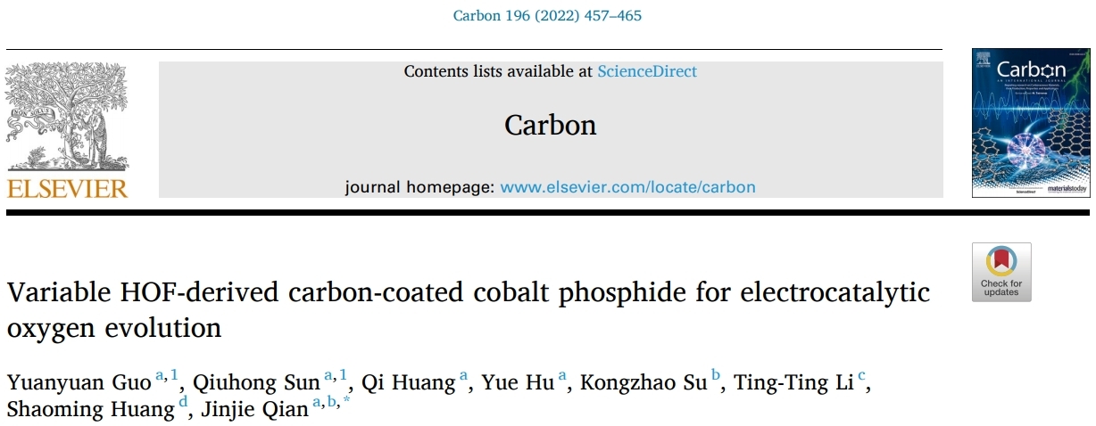 Yuanyuan Guo, et al., Variable HOF-derived carbon-coated cobalt phosphide for electrocatalytic oxygen evolution, Carbon, 2022, 196, 457-465.