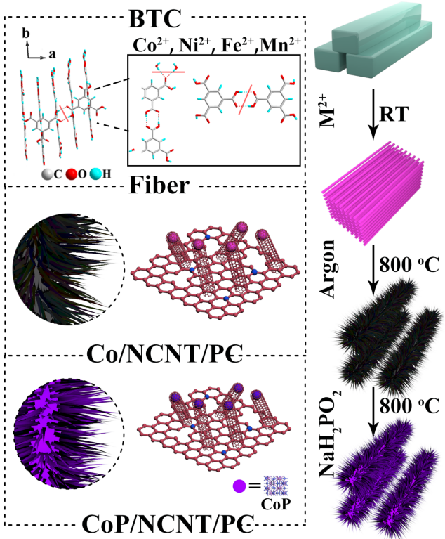 近日,永利3044集团官网钱金杰副研究员等人通过在室温下引入不同二价过渡金属盐,如CoCl2,NiCl2等,对氢键有机框架(hydrogen-bonded organic framework,HOF)的结构进行扰动,实现了从块状均苯三羧酸晶体(1,3,5-benzentricarboxylic acid,BTC)到线状纤维(Fiber)的结构转化。其中,Co(II)离子诱导的Co-Fiber在热解后得到具有高石墨化程度的氮掺杂多壁碳纳米管的三维复合碳材料Co/NCNT/PC。最后,经过磷化处理,钴纳米颗粒在多孔碳层内成功转化为磷化钴,得到CoP/NCNT/PC复合材料,并在OER反应中表现出优异的过电位、动力学和稳定性。