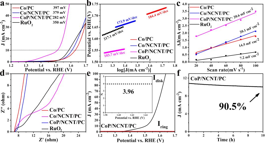 3、HOF衍生的碳包覆的CoP纳米颗粒具有高效的OER催化活性。