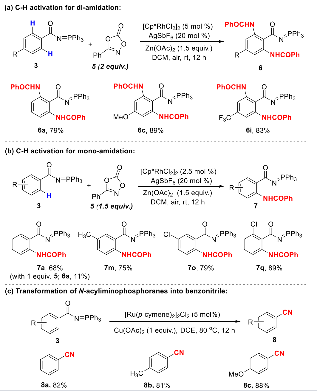 为了探索此种膦酰亚胺类化合物在合成中的应用,作者对产物进行了进一步的衍生化。以产物的亚膦酰基为导向基团,在Rh(III)的催化下,发展了一种新的通过位阻调控实现单、双碳氢键酰胺化反应,并且对底物的官能团容忍性进行了探究,反应产率较高。同时,以Ru(II)为催化剂,醋酸铜为碱,成功将亚膦酰基转化为氰基。