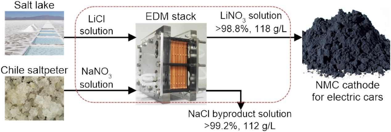 随着动力锂电池需求的激增,LiNi1-y-zMnyCozO2(NMC)已成为炙手可热的正极材料,因而其上游原料的供应极为重要。目前三元锂电池正极材料的锂源主要来自LiOH,但LiOH的制备过程需要额外添加大量化学品,涉及大量副产品和排放,并不理想。同样是三元锂电池前驱体的LiNO3,其传统制备方法主要利用LiOH或Li2CO3与硝酸或硝酸盐反应而制备得到,由于其自身的制备路线较LiOH更为复杂,程序繁琐,制约了其应用。根据文献报道,由硝酸盐制备的NCM正极材料,不管是在电化学性能,还是在容量和循环性能方面,均优于LiOH制得的商业材料。因此,能否找到一种碳足迹低、简易便捷、原子经济的合成硝酸锂的新方法显得尤为重要。