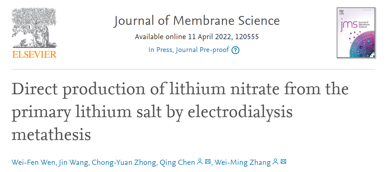 近日,永利张伟明教授课题组在国际著名化学期刊《Journal of Membrane Science》发表了“Direct production of lithium nitrate from the primary lithium salt by electrodialysis metathesis”的论文。该工作实现锂资源的转化,直接从含有锂离子和相应阴离子的两种进料盐中生产锂盐产品,获得高价值LiNO3产物。