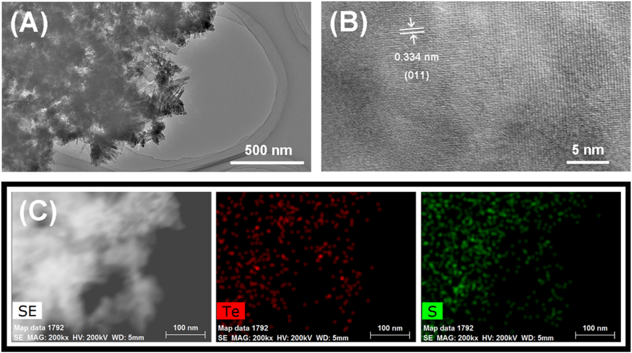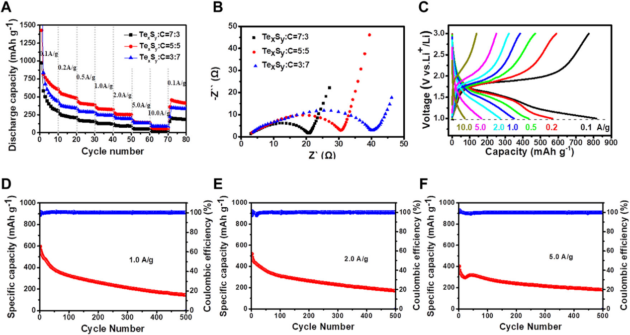 与锂硫、锂硒电池相比,锂-碲(Li-Te)电池由于具有较高的理论体积容量、优异的电子导电性以及缓解穿梭效应而受到越来越多的关注。然而,Te的巨大体积膨胀严重影响了其在新出现的电池系统中的实际应用。因此,如何减轻或消除Te的体积变化对于实现Te的优良性能具有重要意义。这篇工作致力于扩展锂碲硫化电池系列,该系列已被公认为在未来储能系统里是有前景的。本文将一种新的电化学方法应用于微纳米TexSy材料的工程中,发现TexSy相与多壁碳纳米管相结合,使所制备的锂离子电池具有优异的循环稳定性和高倍率性能。在材料合成过程中,硫成功嵌入到碲基体中,提高了整体容量性能。对TexSy进行了表征,验证了它是一种Te少、S多的微纳米结构材料。与原始的纯Te粒子相比,容量大大提高,体积膨胀变化得到有效抑制。Li-TexSy电池组装后,验证了锂离子稳定的电接触和倍率性能,以及显著的电化学性能。该研究通过在TexSy的非线性电化学合成过程中应用不同种类的硫源来设计新型的TexSy相并填补TexSy相图中的一些空白。实验结果表明,不同的硫源对Te有不同的晶格畸变,从而形成不同类型的TexSy相,其中,Na2S衍生的TexSy与多壁碳纳米球磨管赋予了Li-TexSy 电池丰富的体积容量性能和高循环稳定性。