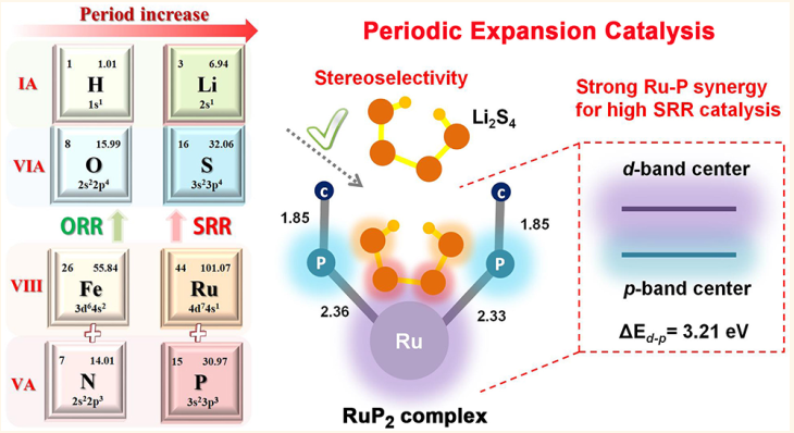 近日,永利杨植教授课题组在国际著名化学期刊《ACS Nano》发表了题为”Sulfur Reduction Catalyst Design Inspired by Elemental Periodic Expansion Concept for Lithium–Sulfur Batteries”的论文。该工作受启发于天然酶中Fe/N活性位点具有高效的氧还原反应特性(Fe/N→ORR),提出周期扩充催化的概念:利用位于Fe/N下一周期的Ru/P,构建仿生催化分子,协同催化锂硫电池中硫的还原反应(Ru/P→SRR)。