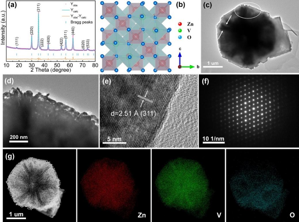 (a) ZVO多面体的XRD谱图和(b)晶体结构示意图。(c, d, e, f) ZVO的SEM,TEM,HRTEM和SAED谱图。(g) ZVO的STEM图和相应的元素映射图。