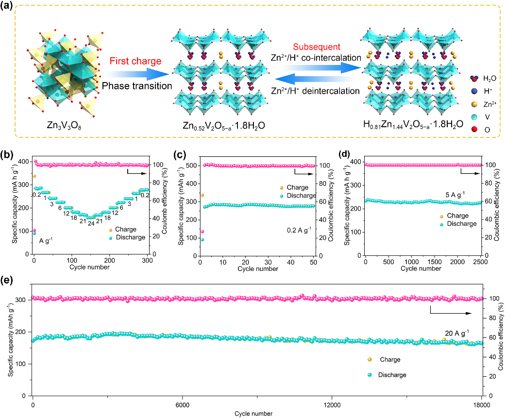 (a)ZVO到ZVOH的相变示意图及ZVOH电极上的电化学反应机理。Zn//ZVOH电池的电化学性能:(b)比电流为0.2 ~24A g-1时的倍率性能。(c, d) ZVOH在0.2和5A g-1时的循环性能。(e) ZVO在20A g-1大电流密度下循环18,000次的长期循环性能。
