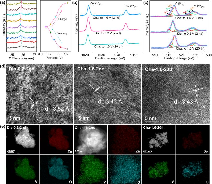 (a) ZVOH的非原位XRD谱图及0.2A g-1时相应的充放电曲线(b)Zn-2p和(c)V-2p的非原位XPS谱图,(d) ZVO在Dis-0.2-2nd、Cha-1.6-2nd和Cha-1.6-20th的HRTEM图像,(e) ZVO在Dis-0.2-2nd、Cha-1.6-2nd和Cha-1.6-20th的STEM图像和的Zn、V和O元素映射。