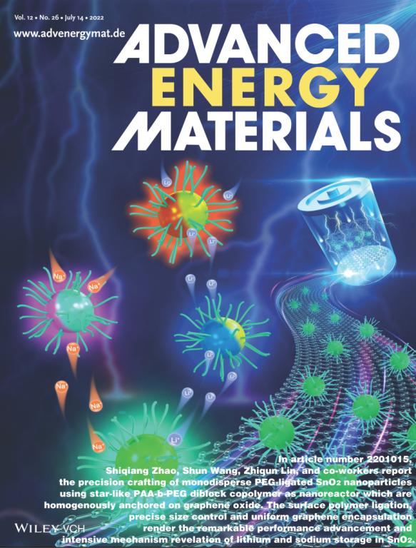 近日,《Advanced Energy Materials》(影响因子:29.698)将永利赵世强副教授第一作者的研究论文“Advancing Performance and Unfolding Mechanism of Lithium and Sodium Storage in SnO2 via Precision Synthesis of Monodisperse PEG-Ligated Nanoparticles”选为期刊封面文章。永利王舜副校长与佐治亚理工学院林志群教授为通讯作者。该研究工作受到国家自然科学基金项目(21905208)的资助。